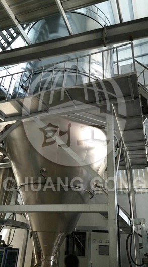 空氣經(jīng)過濾和加熱,進(jìn)入干燥器頂部空氣分配器,熱空氣呈螺旋狀均勻地進(jìn)入干燥室。料液經(jīng)塔體頂部的高速離心霧化器,(旋轉(zhuǎn))噴霧成極細(xì)微的霧狀液珠,與熱空氣并流接觸在極短的時(shí)間內(nèi)可干燥為成品。成品連續(xù)地由干燥塔底部和旋風(fēng)分離器中輸出,廢氣由引風(fēng)機(jī)排空。