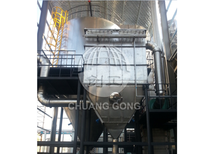 空氣經過濾和加熱,進入干燥器頂部空氣分配器,熱空氣呈螺旋狀均勻地進入干燥室。料液經塔體頂部的高速離心霧化器,(旋轉)噴霧成極細微的霧狀液珠,與熱空氣并流接觸在極短的時間內可干燥為成品。成品連續地由干燥塔底部和旋風分離器中輸出,廢氣由風機排空。